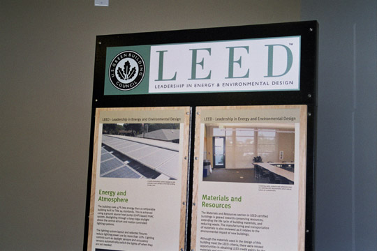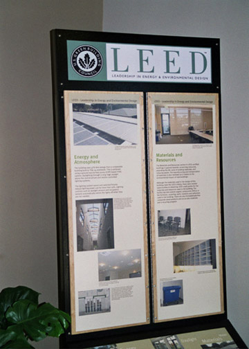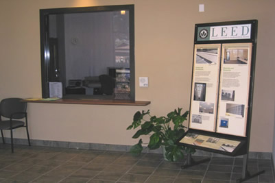 The LEED display is located in the facility's lobby and provides information about sustainable building strategies and the LEED Rating System.