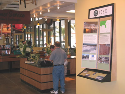 The Whole Foods LEED display, is part of a comprehensive, green building education program. This Whole Foods Market in Sarasota, Florida is one of the first LEED rated grocery stores in the U.S. The display is part of the LEED submission for one education point under the "Innovation and Design Process" category. A Case Study report will also accompany the LEED display as part of the Education program. The display describes each of the LEED categories and how they have been introduced in the building. Topics discussed include an 8,000 gallon underground storage tank as part of a strategy to reduce the use of potable water by seventy percent. In addition, this building is projected to achieve a twenty-five percent reduction in energy usage through efficient refrigeration, HVAC and lighting equipment. The building also incorporates a 'cool roof' that reflects sunlight and reduces cooling requirements by an average of twenty percent. The Whole Foods LEED display, located on a wall near the entrance, is made from sustainable materials including agricultural biocomposites and FSC certified wood. Additional Photos of the Whole Foods LEED Project